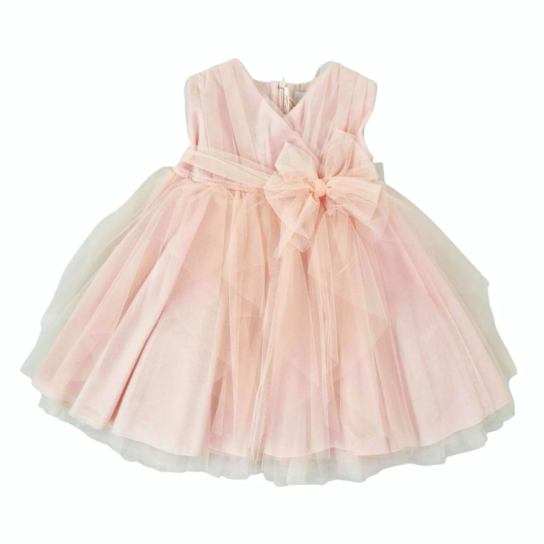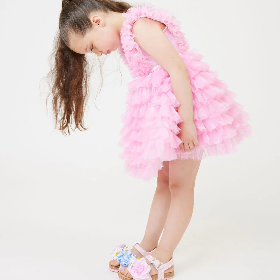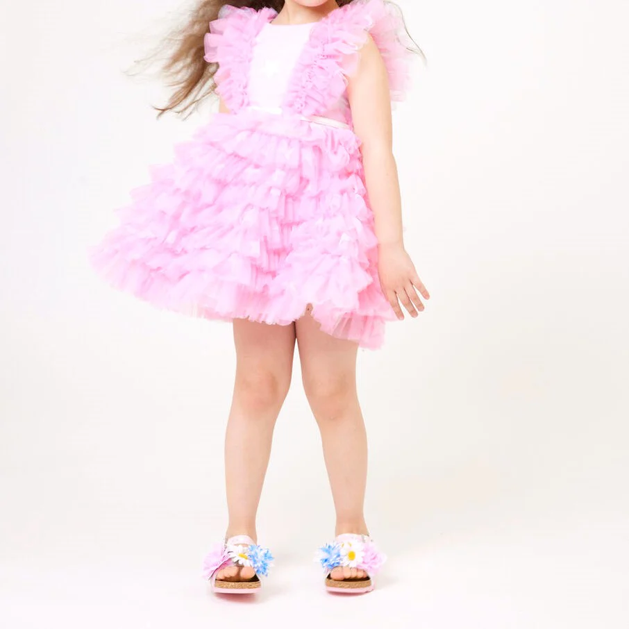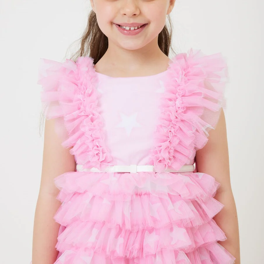 Questo abito in tulle doppiato con stampa stelle all over è perfetto per far brillare ogni bambina. Smanicato e arricchito da due applicazioni verticali a ruche, offre un tocco elegante e raffinato. La cinturina regolabile in pelle assicura una vestibilità comoda, mentre la gonna svasata dona movimento e leggerezza. La chiusura con zip sul retro facilita l’indossamento, e la fodera in mussola di cotone garantisce morbidezza sulla pelle. Un capo unico che unisce comfort e stile per occasioni speciali.