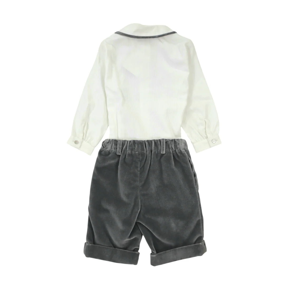 Completo elegante 2 pezzi bambino in morbido velluto raso. La camicia in cotone twill con dettaglio in velluto raso al collo conferisce un tocco di raffinatezza. Il pantalone corto in cotone velluto con risvolto e regolazione in vita, perfetto per feste ed eventi speciali.