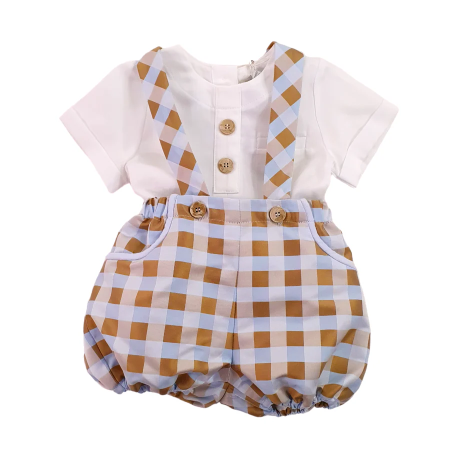 Completo 2 pezzi Barcellino è realizzato con materiali di qualità, come la camicia con collo tondo e abbottonatura dietro con clip e la salopette in caldo cotone stampa tartan su fondo beige e pon pon in pelliccia verde ecologica. Ideale per le occasioni più speciali. Vestibilità abbondante, vedi foto taglia 3 mesi.