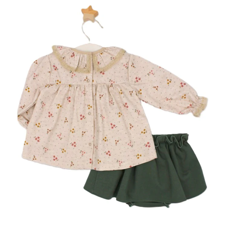 Questo completo per bambina combina stile e comfort: la camicia in cotone flanella presenta un colletto tondo arricciato con raffinata applicazione in pizzo, stampa floreale e un taglio svasato con chiusura dietro per una vestibilità perfetta. La culotte verde cachi in cotone felpato, decorata con elastico arricciato e rouches, aggiunge un tocco di eleganza mantenendo il calore ideale. Perfetto per le occasioni speciali, questo outfit offre un’eleganza discreta e una piacevole sensazione di morbidezza per le piccole più chic.